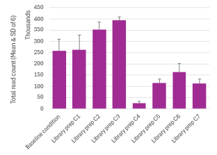 Figure 1: Optimization of library preparation on the MGI E25. Total Assigned Reads (mean ± SD) across tested conditions.
